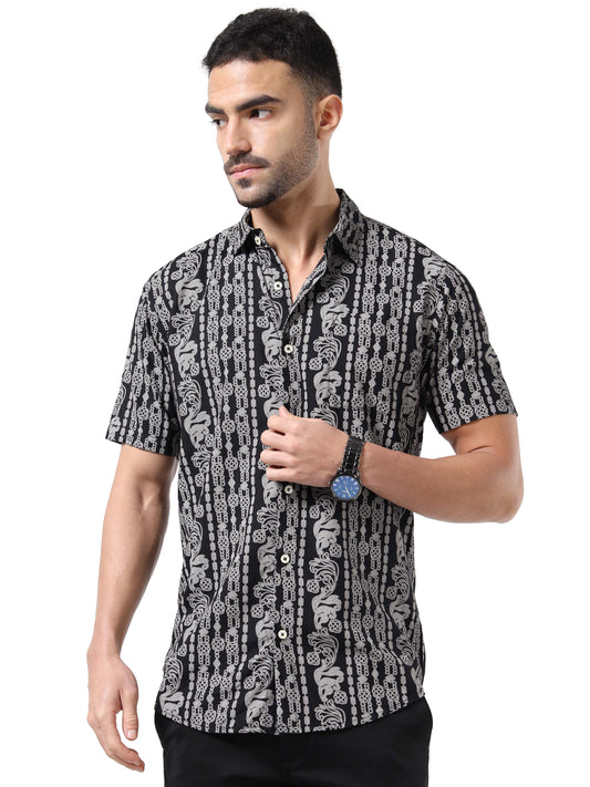 Men Black & Grey Abstract Rayon Slim‑Fit Shirt – Half Sleeves, Spread Collar