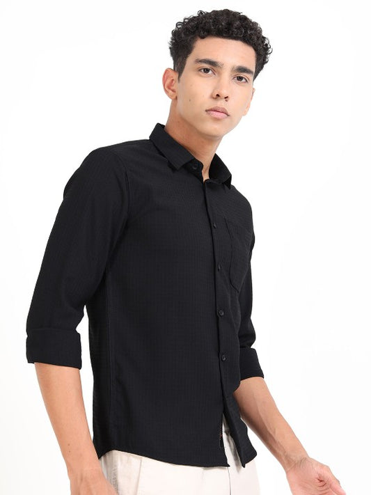 Men Black Textured Slim Fit Cotton Casual Shirt