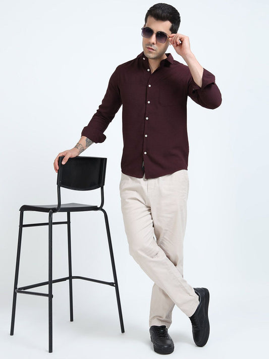 Maroon Textured Slim Fit Cotton Casual Shirt for Men