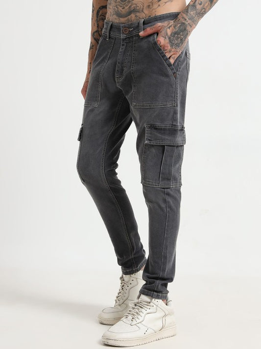 Grey Slim Fit Woven Cargo Pants for Men – Mid-Rise, 6 Pockets, Stretch Cotton