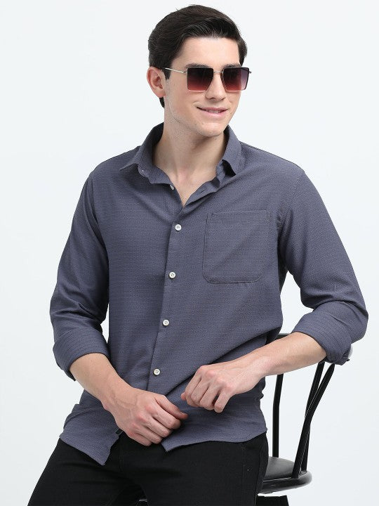 Elevate your everyday wardrobe with this grey textured slim fit casual shirt. Made from breathable cotton, this shirt is tailored for a flattering slim fit and features a spread collar, long sleeves, and a full button placket. The textured finish adds a stylish dimension, while the patch pocket and curved hemline offer classic detailing. Ideal for both work and weekend wear, this shirt is the perfect balance of comfort and modern style.