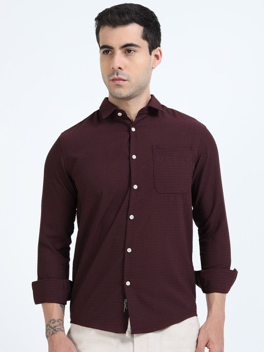 Add depth and sophistication to your casual collection with this maroon textured slim fit shirt. Crafted from soft, breathable cotton, it features a spread collar, full button placket, and a patch pocket for functional style. The textured finish adds a modern touch, while the curved hemline and long sleeves provide a polished look. Perfect for day-to-night wear, this shirt offers the ideal balance of comfort and sharp style.