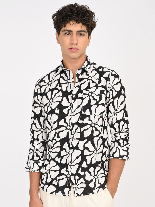 Men Black & White Abstract Printed Slim Fit Cotton Casual Shirt