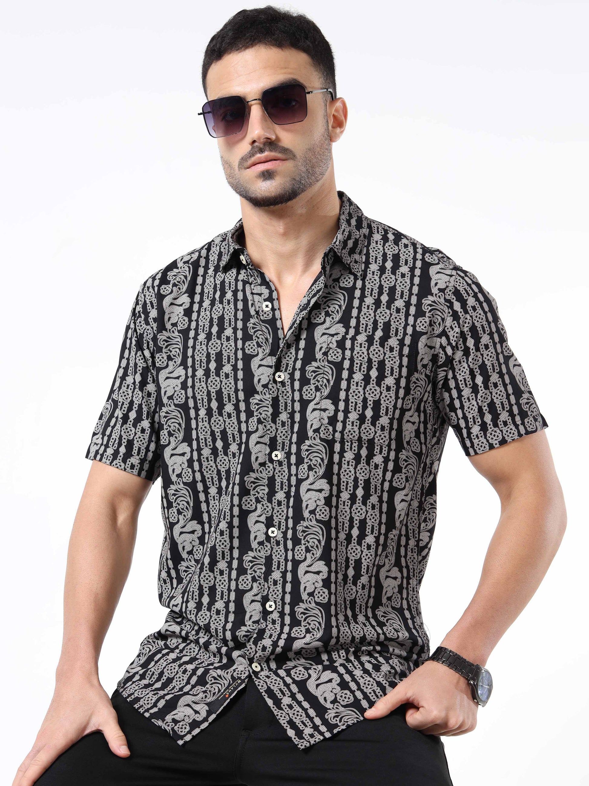 Men Black & Grey Abstract Rayon Slim‑Fit Shirt – Half Sleeves, Spread Collar